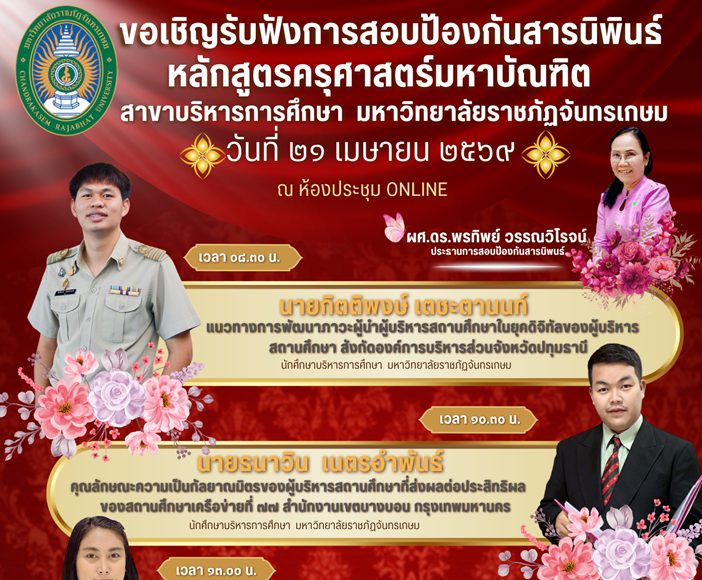 กำหนดการสอบป้องกันการค้นคว้าอิสระของนักศึกษาปริญญาโท หลักสูตรครุศาสตรมหาบัณฑิต สาขาวิชาการบริหารการศึกษา กลุ่ม 4