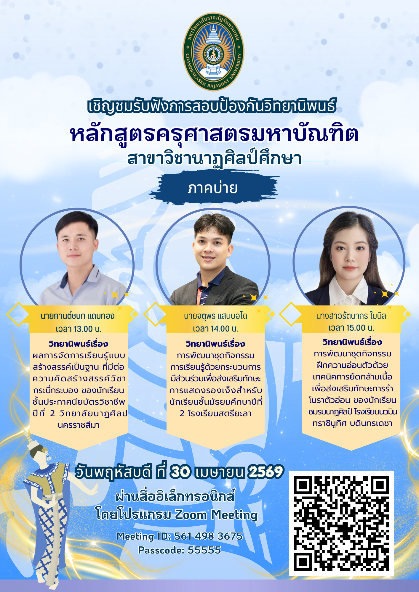 กำหนดการสอบป้องกันวิทยานิพนธ์ ระดับปริญญาโท หลักสูตรครุศาสตรมหาบัณฑิต สาขาวิชานาฏศิลป์ศึกษา